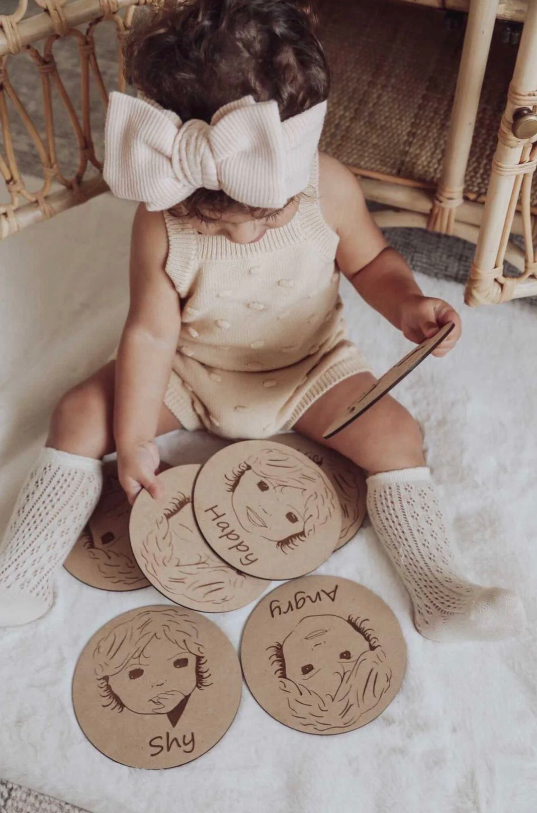 הסט כולל 7 דיסקיות עץ חרוטות להפליא המתארות רגשות